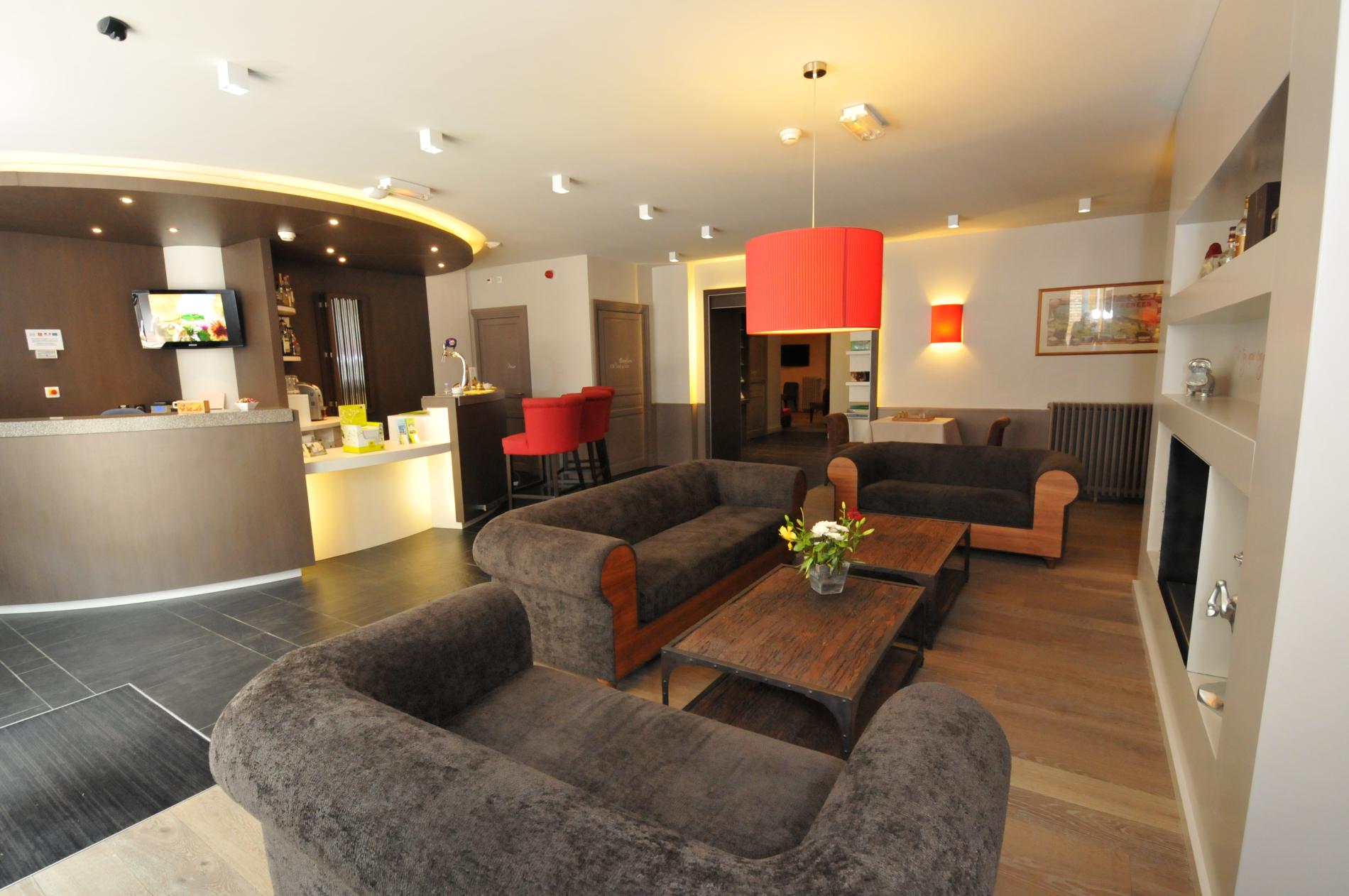 Il y a tout d’abord le petit salon de l’entrée, très convivial avec sa cheminée, sa bibliothèque attenante… et le bar qui vous invite à commander boissons et cafés à déguster confortablement installé dans l’un des canapés moelleux.